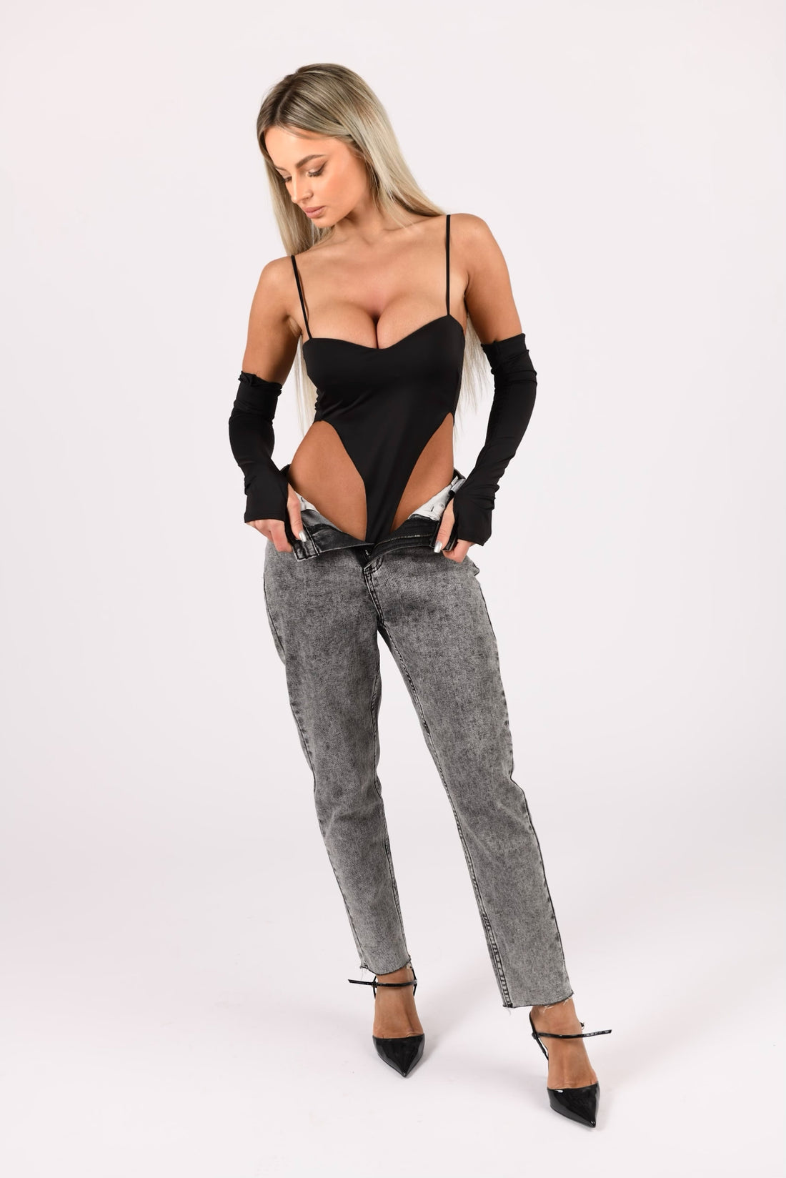 Body nero con maniche lunghe staccabili.